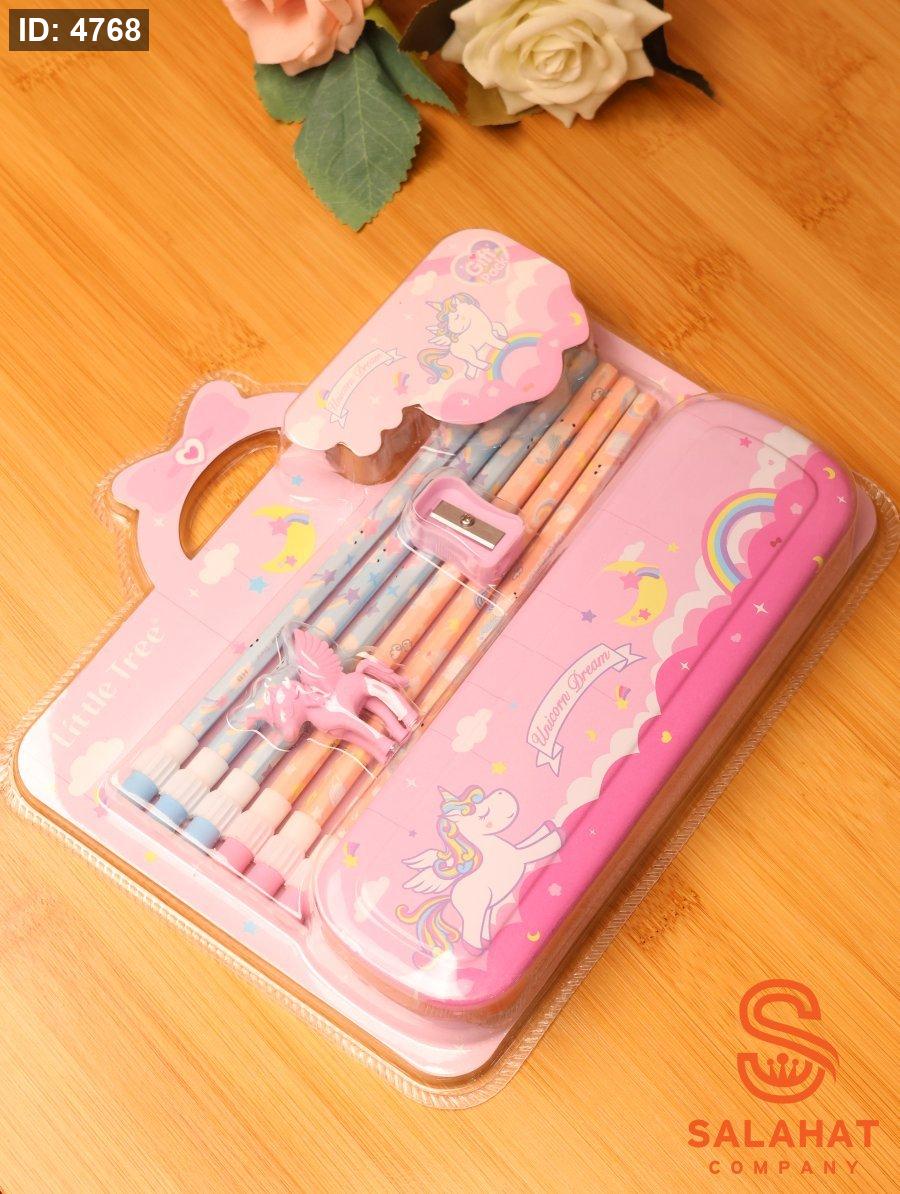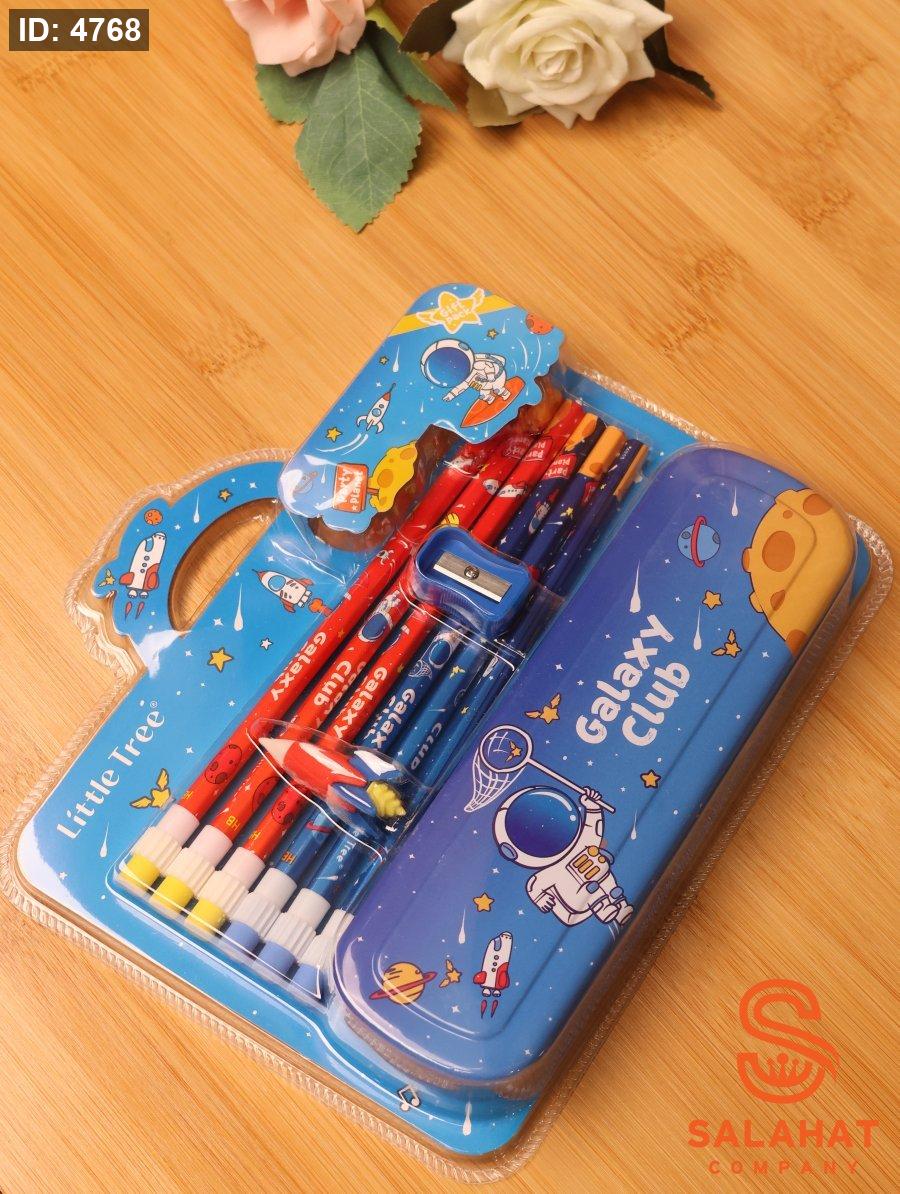 العلبة فيها أقلام رصاص ملونة، ممحيات على شكل صاروخ ورائد فضاء وكواكب، وبالإضافة إلى براية وأدوات صغيرة تجعل الكتابة والدراسة ممتعة.