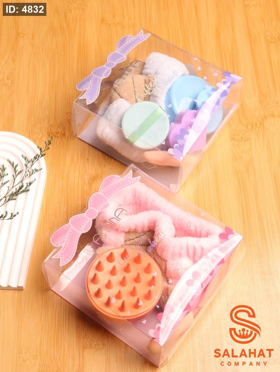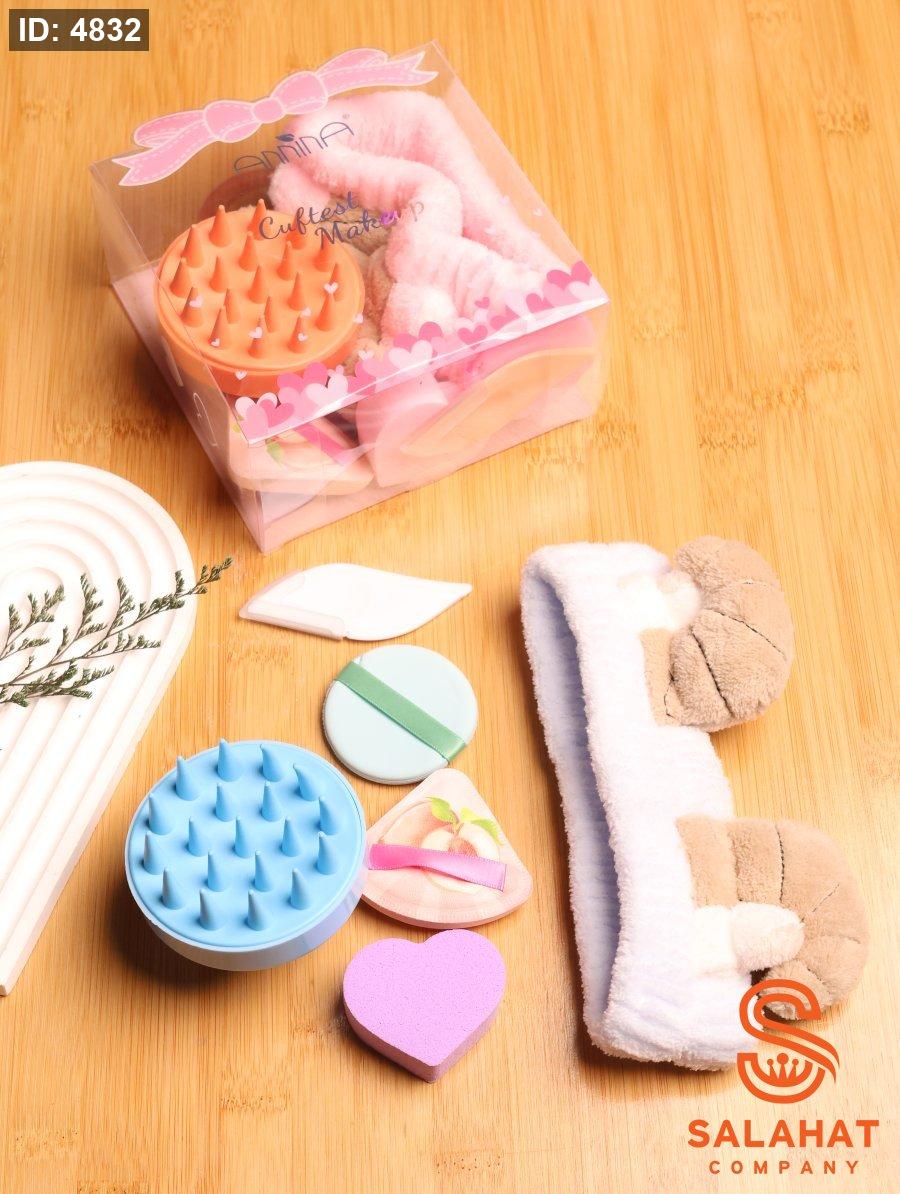 طقم مميز يحتوي على مجموعة أدوات أساسية للعناية اليومية بالبشرة والمكياج. يشمل إسفنجة دمج المكياج (بيوتي بلندر)، فرشاة سيليكون للتنظيف والتقشير اللطيف، بالإضافة إلى رباط شعر ناعم لتثبيت الشعر أثناء روتين العناية.