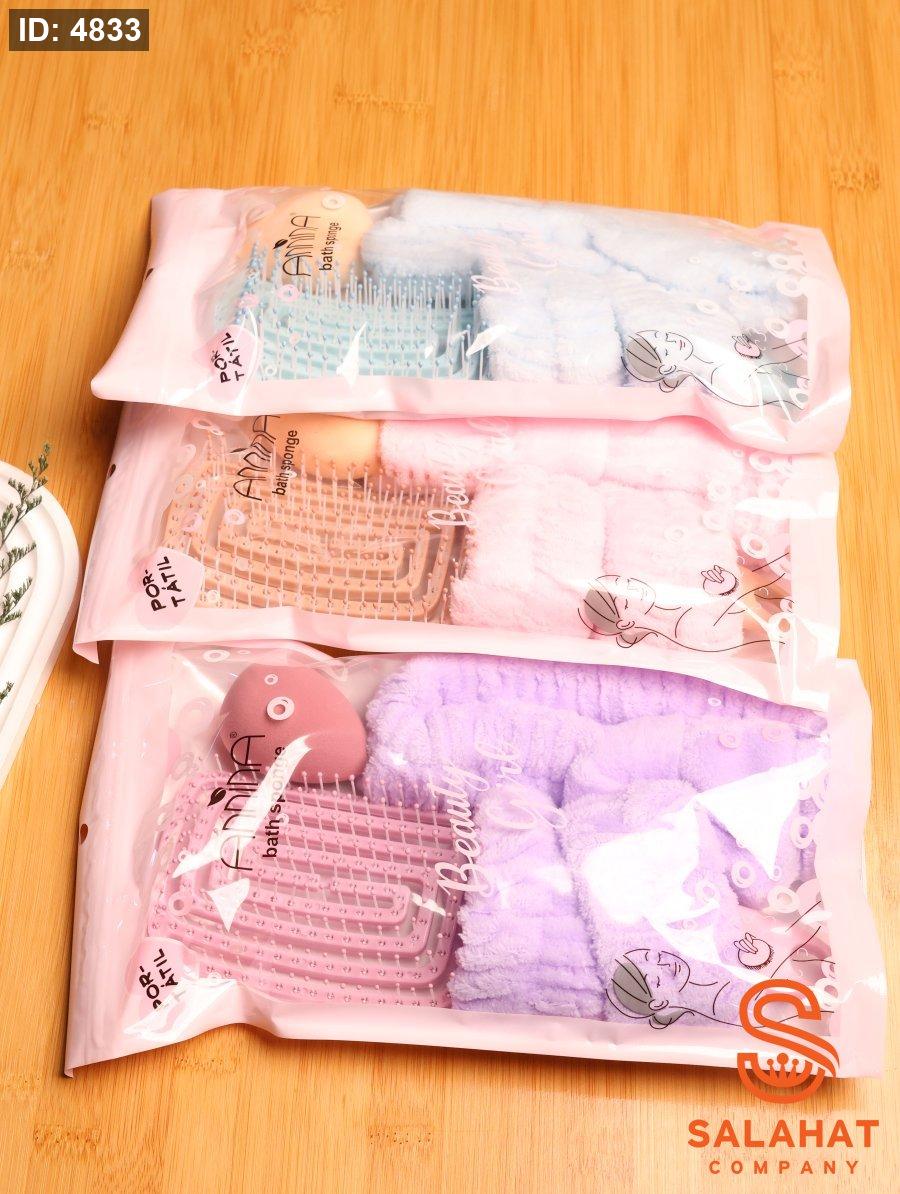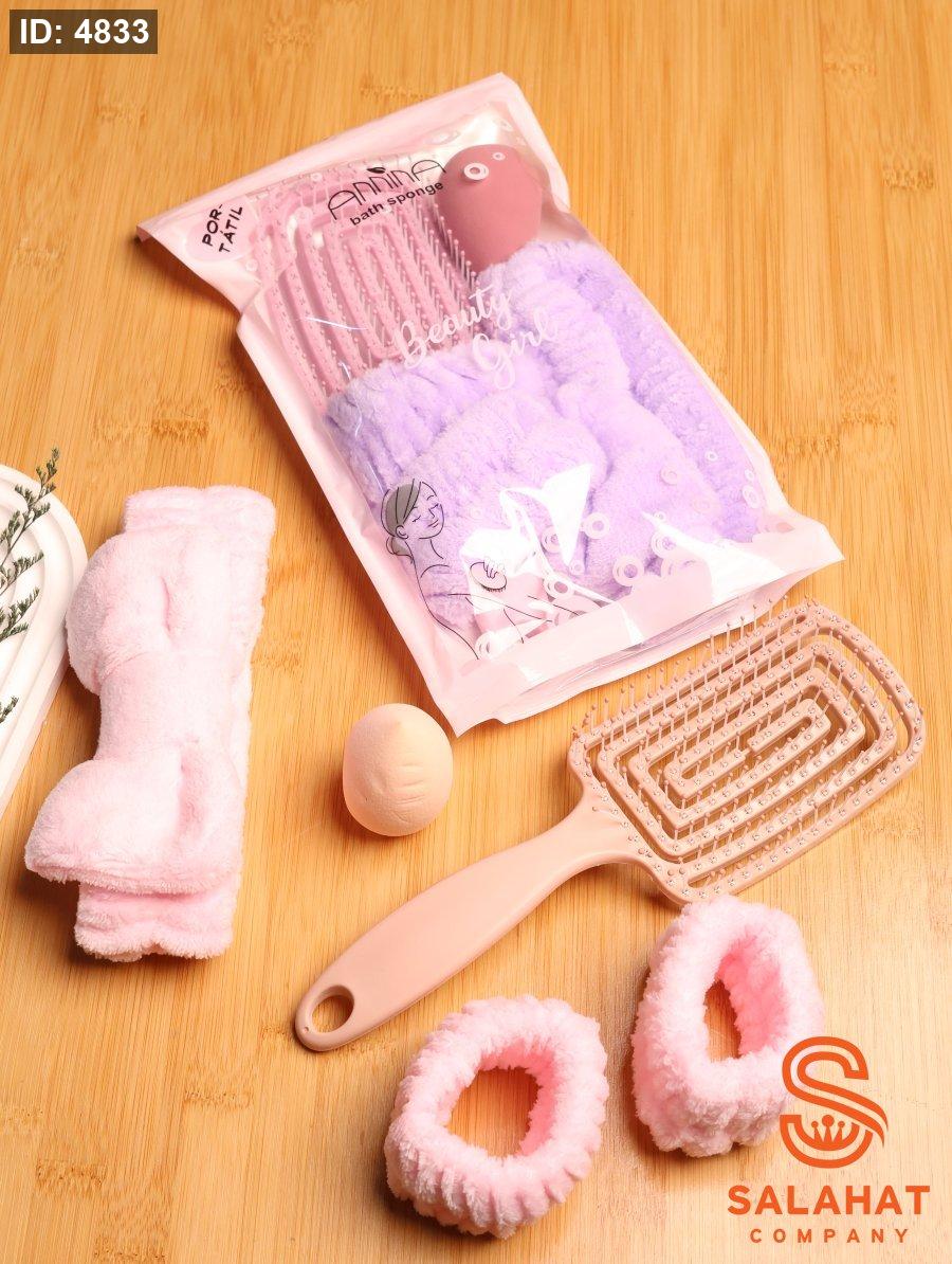 طقم مميز يحتوي على مجموعة أدوات أساسية للعناية اليومية بالبشرة والمكياج. يشمل إسفنجة دمج المكياج (بيوتي بلندر)، فرشاة سيليكون للتنظيف والتقشير اللطيف، بالإضافة إلى رباط شعر ناعم لتثبيت الشعر أثناء روتين العناية.
