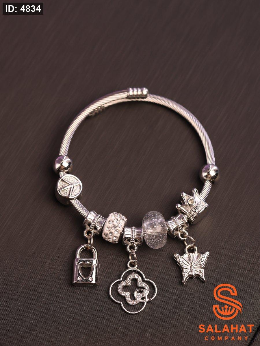 الإسوارة مصنوعة من سلك معدني ملتف باللون الفضي اللامع مع إغلاق محكم وعصري.