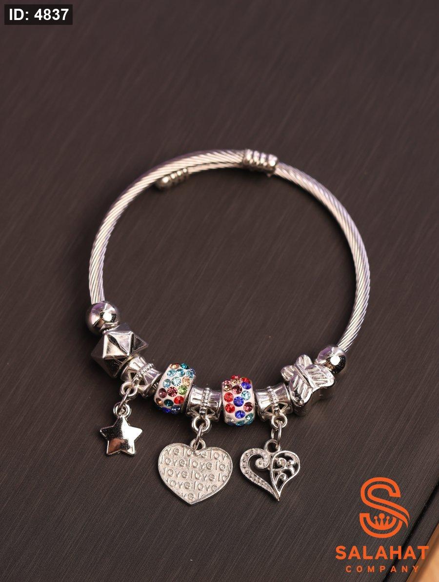الإسوارة مصنوعة من سلك معدني ملتف باللون الفضي اللامع مع إغلاق محكم وعصري.