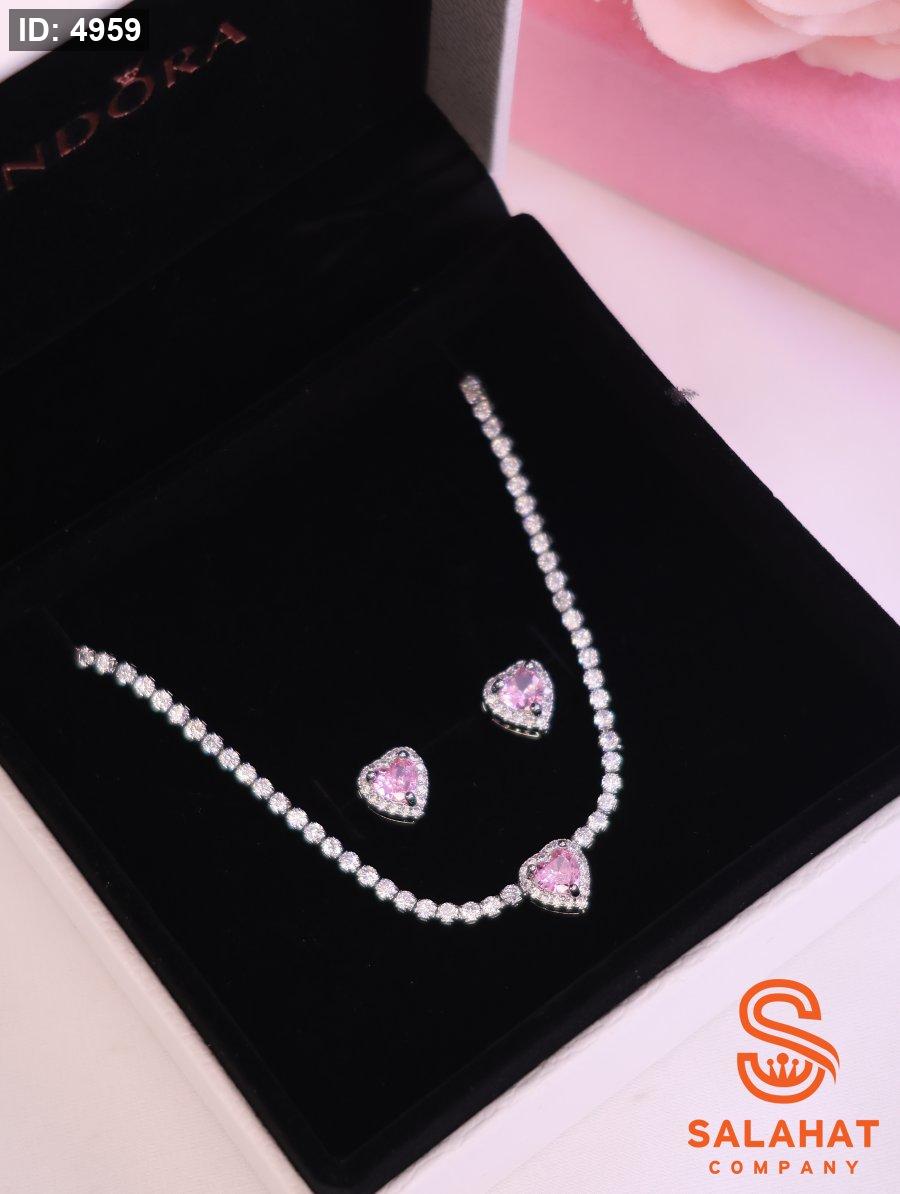 يضم الطقم عقدًا مرصعًا بقطع لامعة تتوسطه قلادة على شكل قلب، مع أقراط متناسقة تضيف لمسة من الجاذبية والأنوثة.