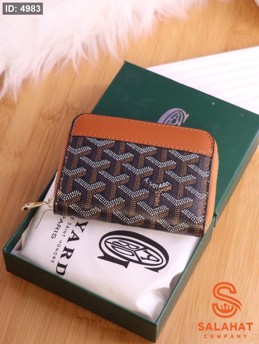 جزدان صغير من Goyard بتصميمه الأيقوني المميز بنقشة Chevron باللون البني الداكن مع الأبيض والبرتقالي، مصنوع من قماش مطلي عالي الجودة مع لمسات من الجلد الطبيعي باللون البني الكاميل.