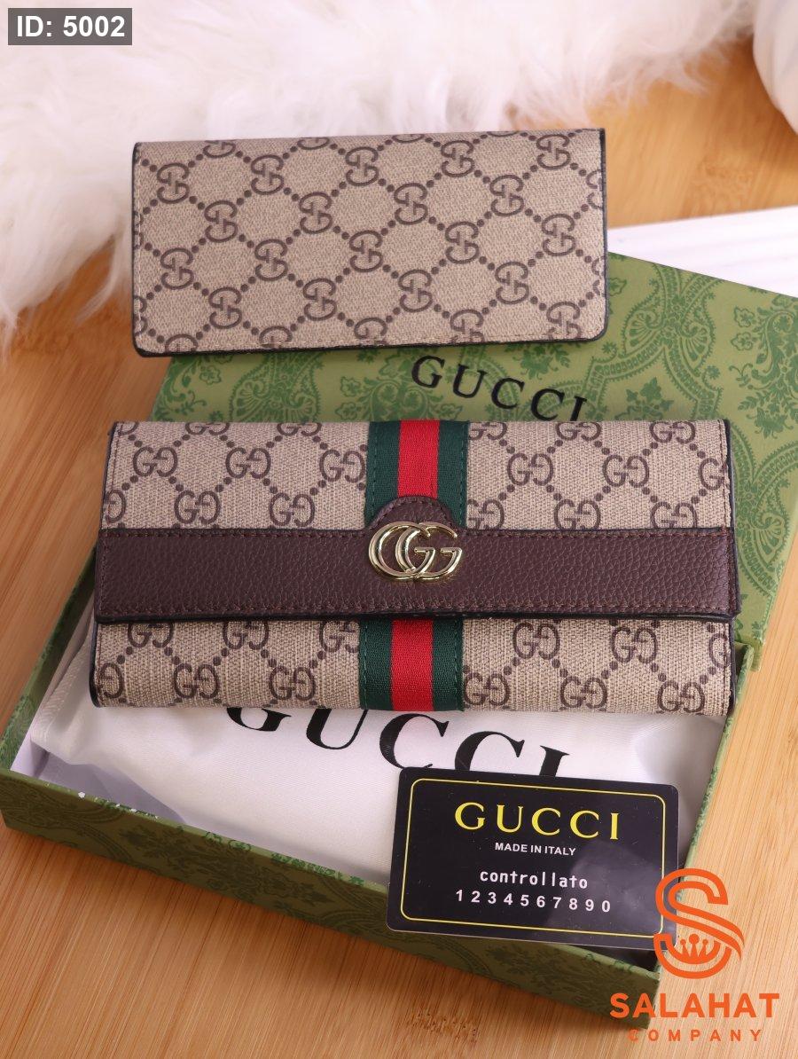 جزدان صغير من جلد GG Supreme البيج، مع شريط باللونين الأحمر والأخضر في المنتصف وشعار GG الذهبي.