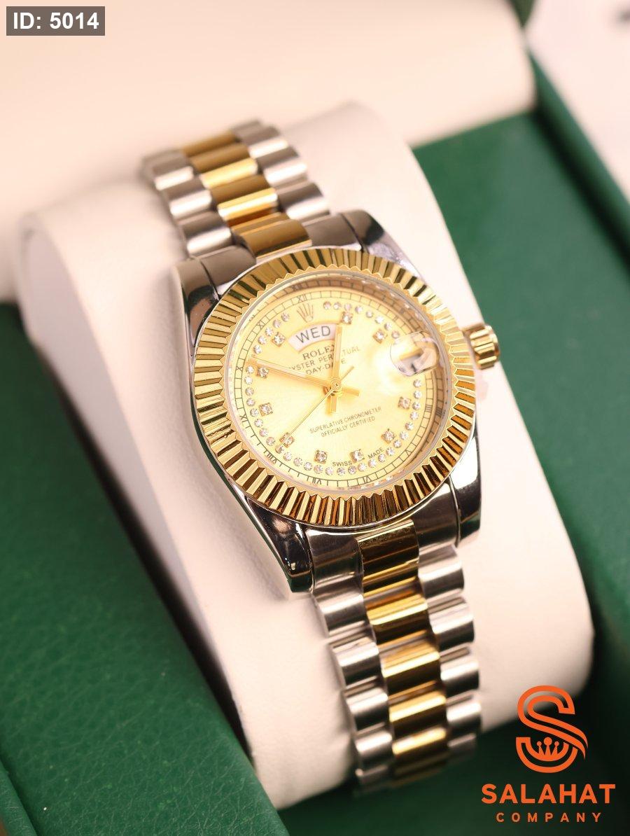 الإطار مسنن من الذهب، مع سوار ثنائي اللون (ذهبي × فضي) بتصميم الـ Jubilee.
