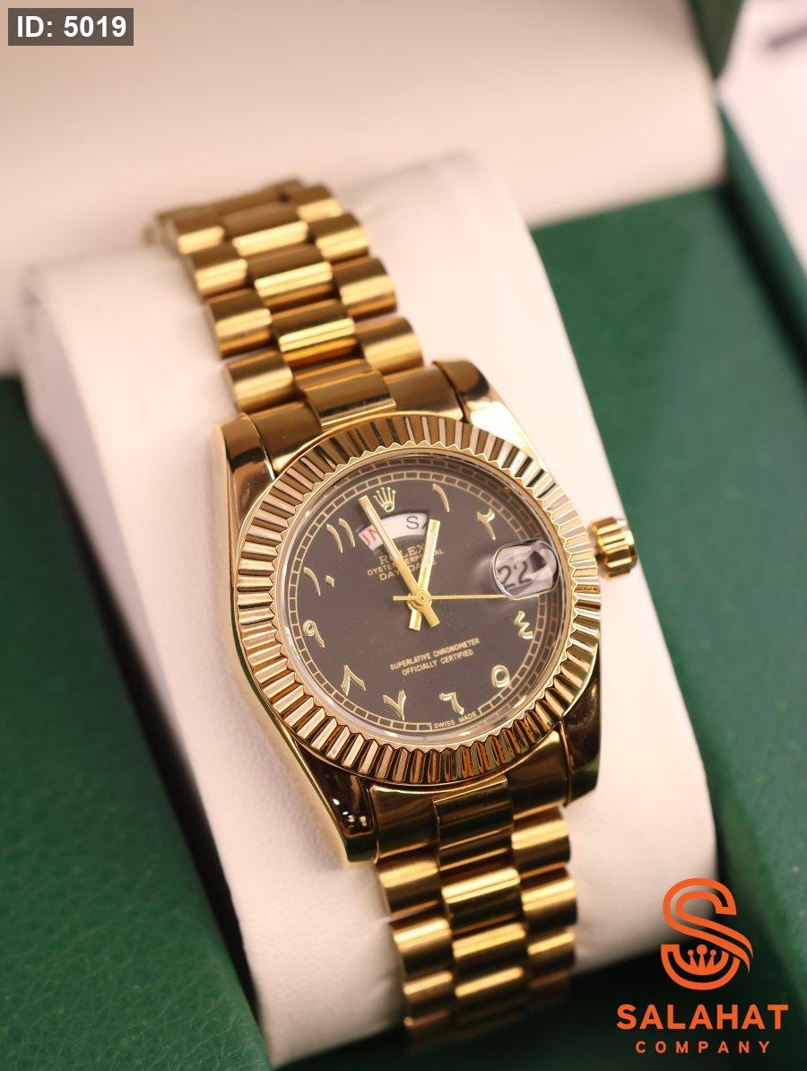 المواصفات: ساعة فاخرة بقرص ذهبي مزيّن بترصيعات من الكريستال أو الألماس كمؤشرات للساعات