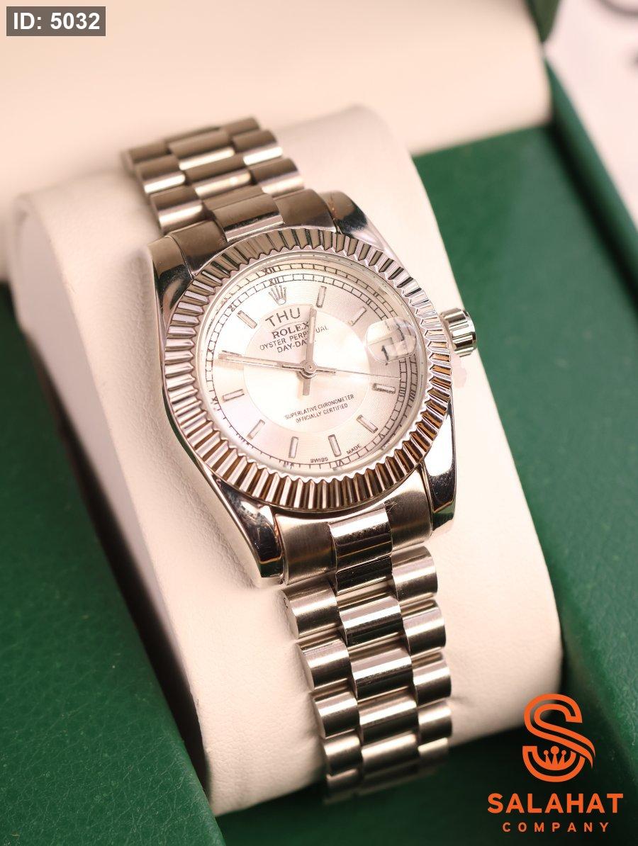 ساعة رولكس Day-Date باللون الفضي الأنيق، مصممة لتجمع بين الفخامة والدقة السويسرية الرفيعة. تأتي بهيكل من الستانلس ستيل المصقول مع سوار معدني متين يمنحها حضوراً قوياً ومظهراً عصرياً يليق بجميع المناسبات.