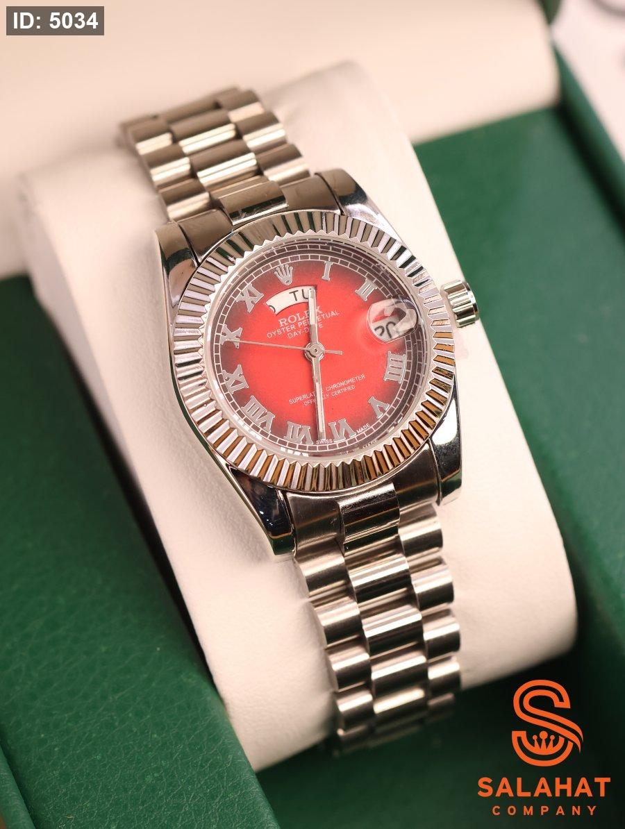 ساعة رولكس Day-Date باللون الفضي الأنيق، مصممة لتجمع بين الفخامة والدقة السويسرية الرفيعة. تأتي بهيكل من الستانلس ستيل المصقول مع سوار معدني متين يمنحها حضوراً قوياً ومظهراً عصرياً يليق بجميع المناسبات.