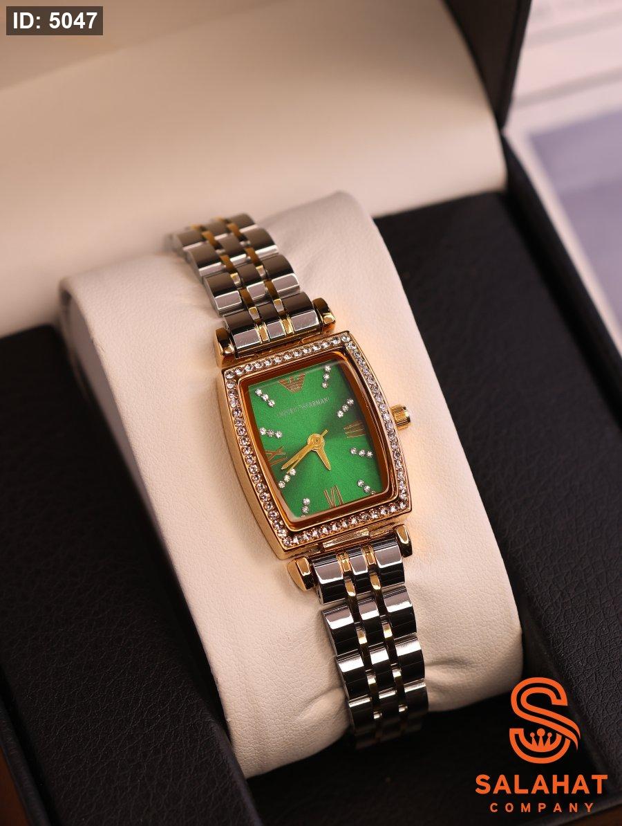 ساعة نسائية أنيقة من إمبوريو أرماني بتصميم مستطيل فاخر، تجمع بين اللونين الذهبي والفضي لإطلالة عصرية راقية.