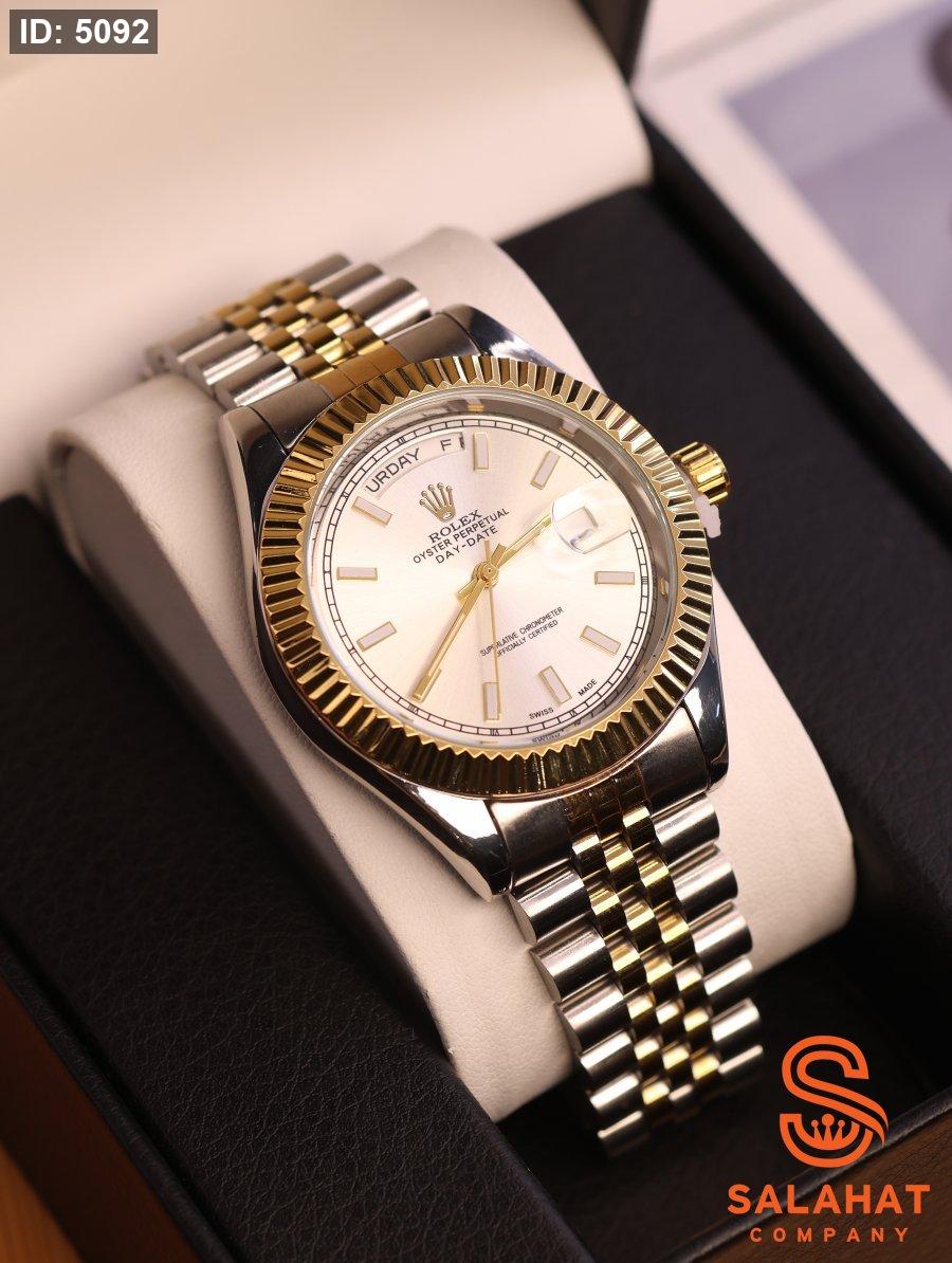 ساعة رولكس Day-Date باللون الفضي الأنيق، مصممة لتجمع بين الفخامة والدقة السويسرية الرفيعة. تأتي بهيكل من الستانلس ستيل المصقول مع سوار معدني متين يمنحها حضوراً قوياً ومظهراً عصرياً يليق بجميع المناسبات.