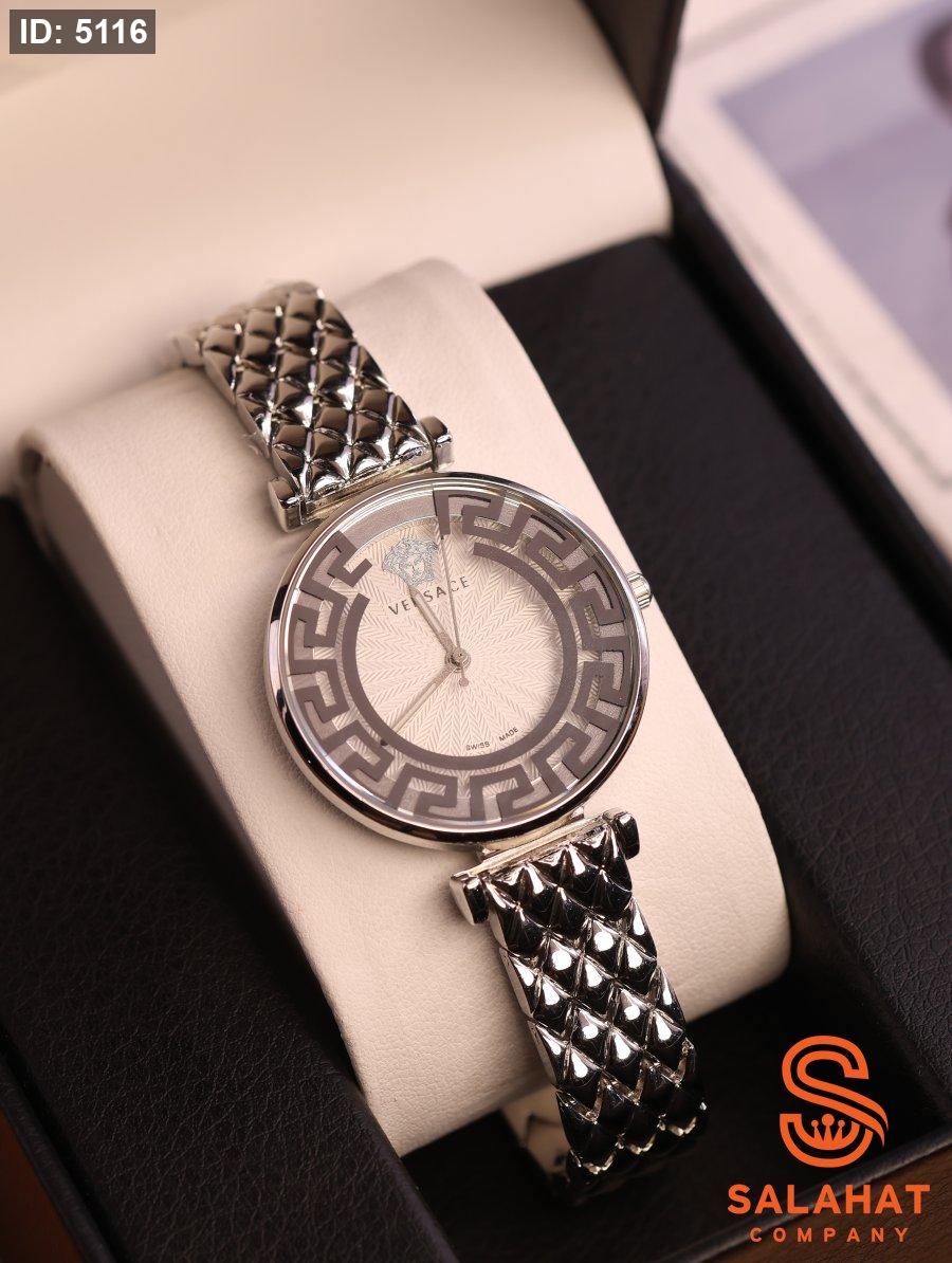 الإطار مزين بالنقشة الإغريقية الشهيرة لفرساتشي، مع مينا أبيض أنيق يحمل توقيع العلامة.