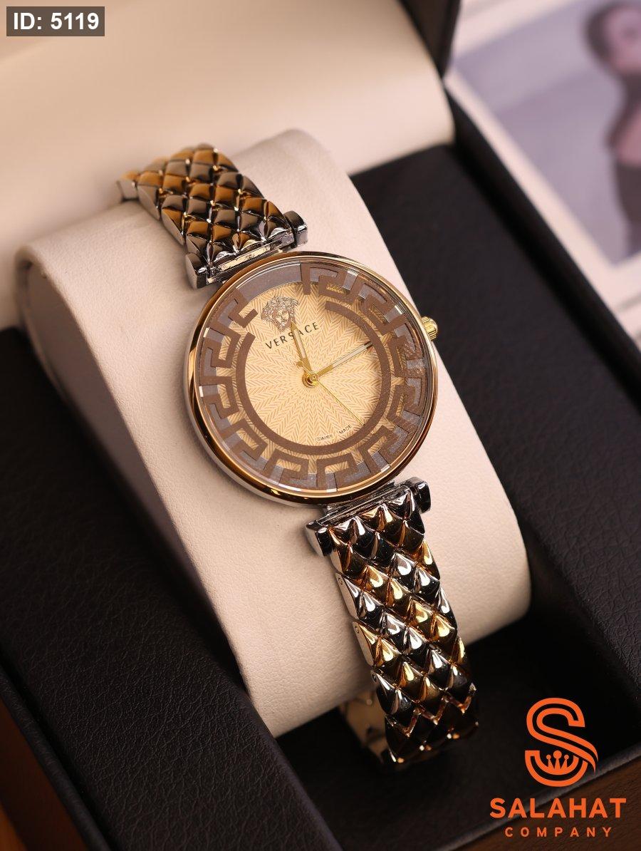 ساعة نسائية فاخرة من فرساتشي بتصميم دائري أيقوني، يجمع بين الذهب والفضة.