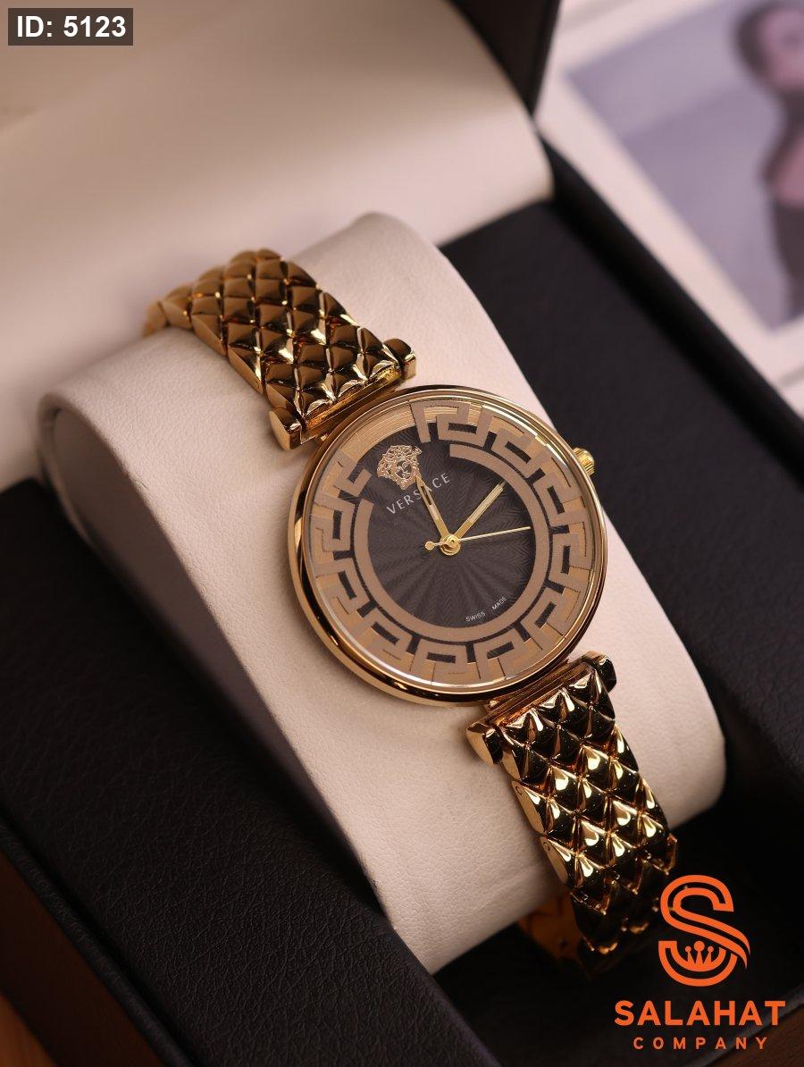 الإطار مزين بالنقشة الإغريقية الشهيرة لفرساتشي، مع مينا أبيض أنيق يحمل توقيع العلامة.