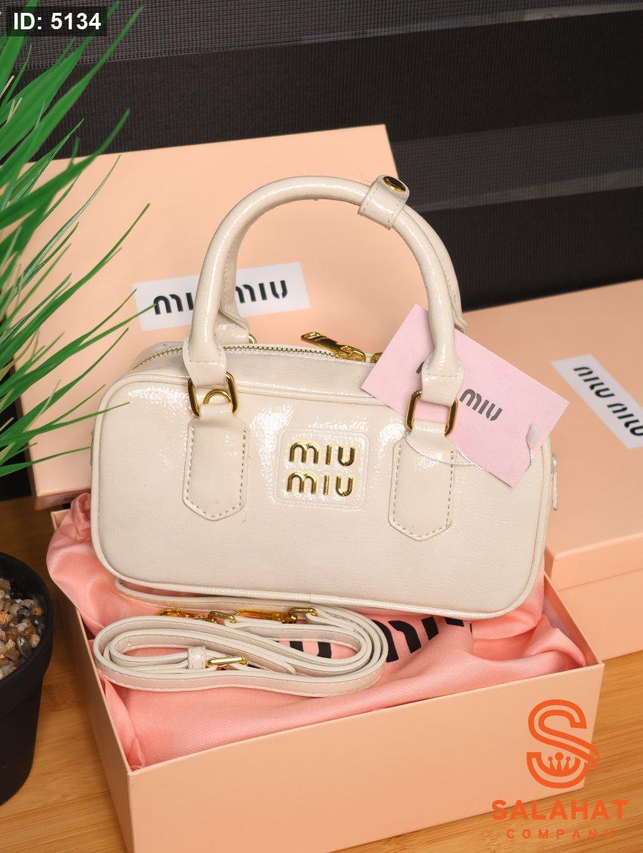 شنطة أنيقة من Miu Miu بلون  لامع ناعم، بتصميم صغير وعصري مع مقبض يد مزدوج وحزام إضافي طويل يمكن تعديله وحمله ككروس.