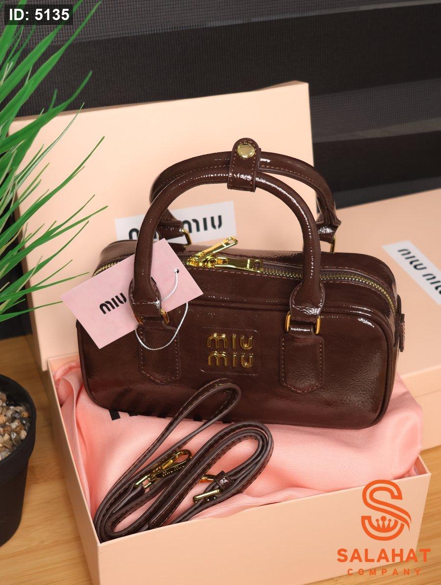شنطة أنيقة من Miu Miu بلون لامع ناعم، بتصميم صغير وعصري مع مقبض يد مزدوج وحزام إضافي طويل يمكن تعديله وحمله ككروس.