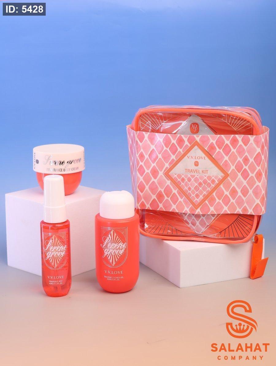 مجموعة سفر عملية تجمع بين البدي كريم، الشاور جل، والفراغنس ميست داخل حقيبة أنيقة وعصرية.